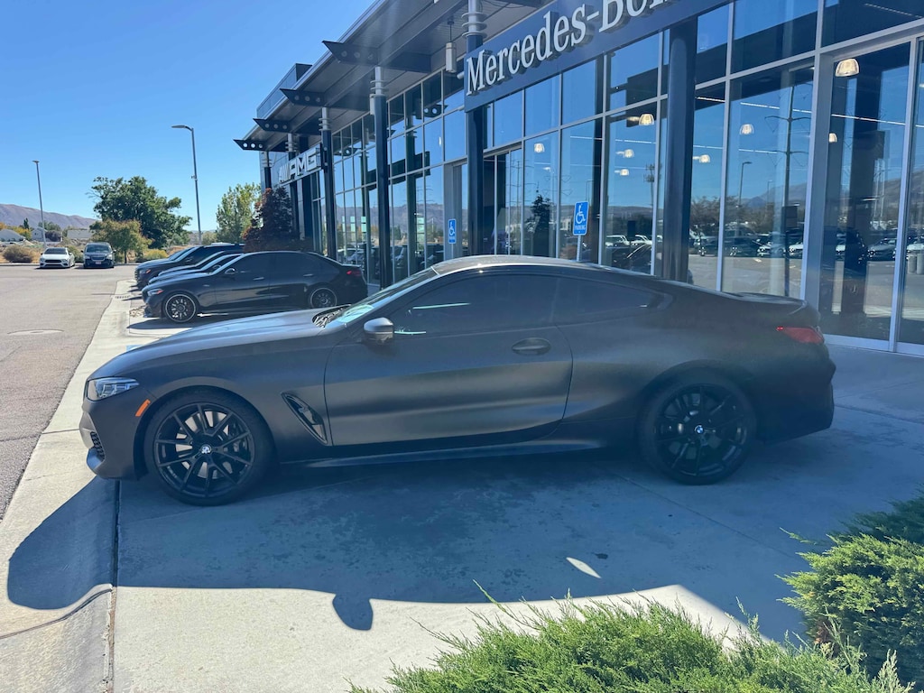 Mercedes-Benz of Draper proudly offers this 2022 Black Sapphire Metallic BMW 8 Series M850i xDrive AWD . It is well equipped and includes these features and benefits: Connected Package Pro, Driving Assistance Package (Active Blind Spot Detection, Active Driving Assistant, Active Park Distance Control, Drive Recorder, Parking Assistant Plus, Rear-View Camera, and Surround View w/3D View), Driving Assistance Professional Package (Active Driving Assistant Pro and Extended Traffic Jam Assistant), 16 Speakers, 4-Wheel Disc Brakes, ABS brakes, Adaptive suspension, Air Conditioning, Alloy wheels, AM/FM radio: SiriusXM with 360L, Anthracite Alcantara Headliner, Apple CarPlay & Android Auto Compatibility, Apple CarPlay Compatibility, Auto High-beam Headlights, Auto tilt-away steering wheel, Auto-dimming door mirrors, Auto-dimming Rear-View mirror, Automatic temperature control, BMW Assist eCall, BMW TeleServices, Bowers & Wilkins Diamond Surround Sound System (DISC), Brake assist, Bumpers: body-color, Carbon Fiber Trim, ConnectedDrive Services, Delay-off headlights, Door auto-latch, Driver door bin, Driver vanity mirror, Dual front impact airbags, Dual front side impact airbags, Electronic Stability Control, Emergency communication system: BMW Assist eCall, Extended Merino Leather Upholstery, Extended Shadowline Trim, Exterior Parking Camera Rear, Four wheel independent suspension, Front anti-roll bar, Front Bucket Seats, Front Center Armrest, Front dual zone A/C, Front reading lights, Front Ventilated Seats, Fully automatic headlights, Garage door transmitter, Glass Controls, harman/kardon Surround Sound System, harman/kardon® Speakers, Heads-Up Display, Heated door mirrors, Heated front seats, Heated Front Seats, Armrests & Steering Wheel, Heated steering wheel, Illuminated entry, Leather Shift Knob, Leather steering wheel, Live Cockpit Pro w/Navi, Low tire pressure warning, M Carbon Roof, M Sport Brakes w/Black Calipers, Memory seat, Multi-Functional Seats, Navigation System, Occupant sensing airbag, Outside temperature display, Overhead airbag, Panic alarm, Passenger door bin, Passenger vanity mirror, Power door mirrors, Power driver seat, Power passenger seat, Power steering, Power windows, Radio data system, Radio: AM/FM Audio System, Rain sensing wipers, Rear anti-roll bar, Rear window defroster, Remote keyless entry, Security system, SiriusXM w/360L, Speed control, Speed-sensing steering, Speed-Sensitive Wipers, Split folding rear seat, Spoiler, Sport steering wheel, Steering wheel memory, Steering wheel mounted audio controls, Tachometer, Telescoping steering wheel, Tilt steering wheel, Traction control, Trip computer, Turn signal indicator mirrors, Variably intermittent wipers, Ventilated front seats, Wheels: 20 x 8 Fr & 20 x 9 Rr M V-Spoke, Wheels: 20 x 8 Fr & 20 x 9 Rr M V-Spoke (1N1), WiFi Hotspot, Wireless Charging, and Wireless Charging (DISC)