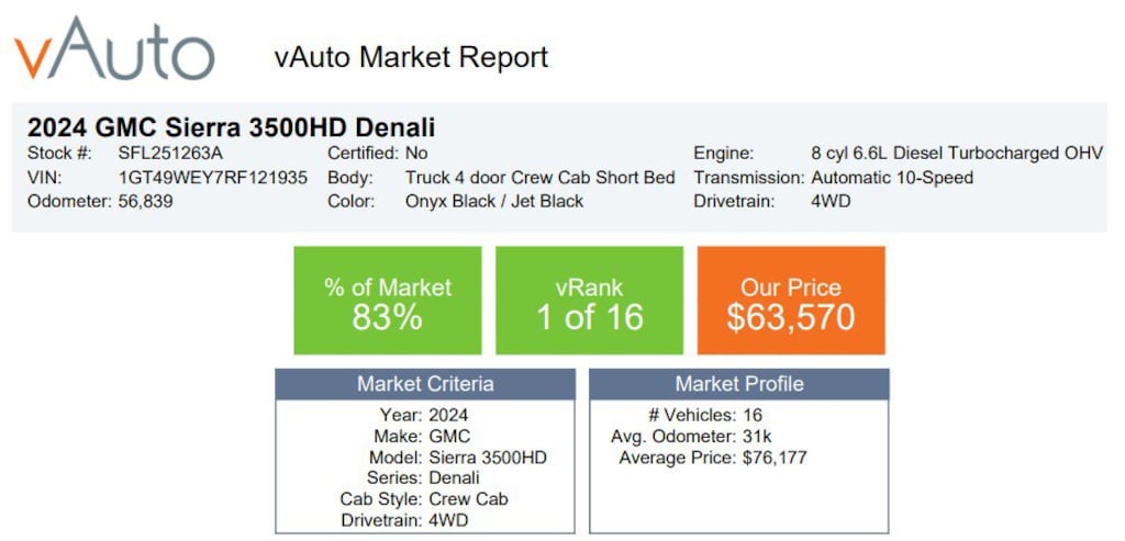 Denali Reserve Package (Power Sunroof), Gooseneck/5th Wheel Prep Package, Preferred Equipment Group 5SA (120-Volt Bed Mounted Power Outlet, 120-Volt Instrument Panel Power Outlet, 2 Charge-Only Rear USB Ports, 2 Charge/Data USB Ports Inside Center Console, 2 USB Ports, 2-Speed Active Transfer Case, Bed View Camera w/2 Trailer Camera Provisions, Bose Premium 7-Speaker Sound System, Deep-Tinted Glass, Electric Rear-Window Defogger, Floor-Mounted Center Console, Front Rain-Sensing Wipers, HD Surround Vision, Heated 2nd Row Outboard Seats, Heated Driver & Front Outboard Passenger Seats, Integrated Trailer Brake Controller, Keyless Open & Start, LED Cargo Area Lighting, LED Smoked Amber Roof Marker Lamps, Manual Tilt-Wheel/Telescoping Steering Column, Polished Exhaust Tip, Power Front Windows w/Passenger Express Up/Down, Power Sliding Rear Window w/Defogger, Push Button Start, Rear Cross Traffic Alert, Rear Wheelhouse Liners, Remote Vehicle Starter System, Safety Alert Seat, Signature Chrome Denali Grille, SiriusXM w/360L, Spray-On Pickup Bedliner w/Denali Logo, Steering Wheel Audio Controls, Trailer Camera Provisions, Trailer Side Blind Zone Alert, Ultrasonic Front & Rear Park Assist, Unauthorized Entry Theft-Deterrent System, Universal Home Remote, Ventilated Driver & Front Passenger Seats, Wireless Charging, and Wireless Phone Projection), Technology Package (Adaptive Cruise Control, Auto-Dimming Inside Rearview Mirror w/Camera, and Multicolor 15 Diagonal Head-Up Display), X31 Off-Road Package (Hill Descent Control), 10-Speed Automatic, 4WD, Jet Black Leather, 12-Way Power Driver Seat Adjuster w/Lumbar, 12-Way Power Passenger Seat Adjuster w/Lumbar, 220 Amp Alternator, 4-Wheel Disc Brakes, 7 Speakers, ABS brakes, Air Conditioning, Alloy wheels, AM/FM radio: SiriusXM with 360L, Apple CarPlay/Android Auto, Auto High-beam Headlights, Auto-dimming door mirrors, Auto-dimming Rear-View mirror, Automatic Emergency Braking, Automatic temperature control, Black Front & Rear Molded Splash Guards (LPO), Brake assist, Buckle to Drive, Bumpers: body-color, Compass, Delay-off headlights, Driver door bin, Driver Memory, Driver vanity mirror, Dual front impact airbags, Dual front side impact airbags, Electronic Stability Control, Emergency communication system: OnStar and GMC connected services capable, Engine Block Heater, Exhaust Brake, Following Distance Indicator, Forge Perforated Leather-Appointed Seat Trim, Forward Collision Alert, Front anti-roll bar, Front Bucket Seats, Front Center Armrest, Front dual zone A/C, Front fog lights, Front License Plate Kit, Front Pedestrian Braking, Front reading lights, Front wheel independent suspension, Fully automatic headlights, Garage door transmitter, Genuine wood dashboard insert, Genuine wood door panel insert, GMC Premium 13.4 Diagonal Information Display, Heated door mirrors, Heated front seats, Heated rear seats, Heated steering wheel, Heavy-Duty 80 Amp-Hr Battery, Hitch Guidance w/Hitch View, Illuminated entry, IntelliBeam Automatic High Beam On/Off, Lane Departure Warning System, Low tire pressure warning, Memory seat, Occupant sensing airbag, Off-Road Suspension, Outside temperature display, Overhead airbag, Overhead console, Panic alarm, Passenger door bin, Passenger vanity mirror, Pickup Bed, Power door mirrors, Power driver seat, Power passenger seat, Power steering, Power windows, Power-Retractable Assist Steps, Premium audio system: Premium GMC Infotainment System, Radio: AM/FM w/Premium GMC Infotainment System, Rain sensing wipers, Rear reading lights, Rear seat center armrest, Rear step bumper, Rear window defroster, Remote keyless entry, Security system, Speed control, Speed-sensing steering, Split folding rear seat, Steering wheel mounted audio controls, Tachometer, Telescoping steering wheel, Tilt stee