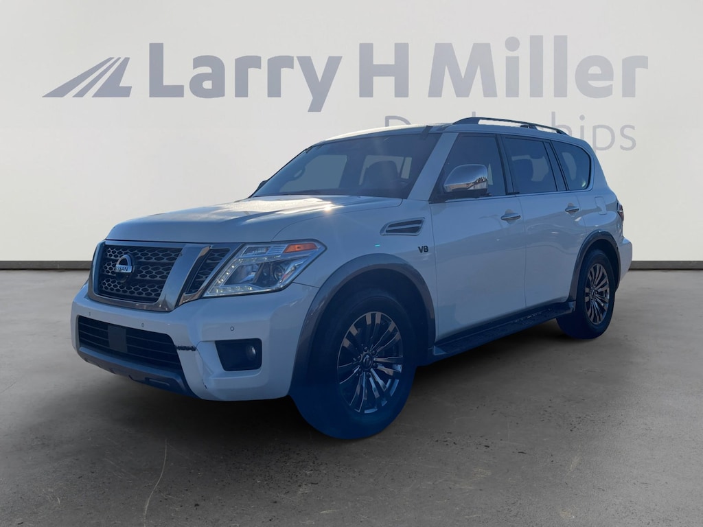 This 2018 Pearl White Nissan Armada Platinum RWD is well equipped and includes these features and benefits: Captain Seat Package (Second Row Captain's Chairs and Second Row Center Console w/ Padded Armrest), Platinum Reserve Package (20 Dark Chrome Wheels), 13 Speakers, 2.937 Axle Ratio, 3rd row seats: split-bench, 4-Wheel Disc Brakes, A/V remote, ABS brakes, Air Conditioning, Alloy wheels, AM/FM radio: SiriusXM, Anti-whiplash front head restraints, Auto tilt-away steering wheel, Auto-dimming door mirrors, Auto-dimming Rear-View mirror, Auto-leveling suspension, Automatic temperature control, Brake assist, Bumpers: body-color, CD player, Delay-off headlights, Driver door bin, Driver vanity mirror, Dual front impact airbags, Dual front side impact airbags, Electronic Stability Control, Emergency communication system: NissanConnect Services, Four wheel independent suspension, Front anti-roll bar, Front Bucket Seats, Front Center Armrest, Front dual zone A/C, Front fog lights, Front reading lights, Fully automatic headlights, Garage door transmitter: HomeLink, Headphones, Heated & Cooled Front Bucket Seats w/Driver Memory, Heated door mirrors, Heated front seats, Heated rear seats, Heated steering wheel, Illuminated entry, Lane Departure Warning System, Leather Shift Knob, Leather-Appointed Seat Trim, Low tire pressure warning, Memory seat, Navigation System, Occupant sensing airbag, Outside temperature display, Overhead airbag, Overhead console, Panic alarm, Passenger door bin, Passenger vanity mirror, Power door mirrors, Power driver seat, Power Liftgate, Power moonroof, Power passenger seat, Power steering, Power windows, Radio data system, Radio: Bose AM/FM/SXM/CD/MP3/HD Radio, Rain sensing wipers, Rear air conditioning, Rear anti-roll bar, Rear reading lights, Rear seat center armrest, Rear window defroster, Rear window wiper, Reclining 3rd row seat, Remote keyless entry, Roof rack: rails only, Security system, Speed control, Speed-sensing steering, Speed-Sensitive Wipers, Split folding rear seat, Spoiler, Steering wheel memory, Steering wheel mounted audio controls, Tachometer, Telescoping steering wheel, Tilt steering wheel, Traction control, Trip computer, Turn signal indicator mirrors, Variably intermittent wipers, Ventilated front seats, Voltmeter, and Wheels: 20 Machine-Faced Chrome w/Tinted CC. 13 Speakers, 2.937 Axle Ratio, 20 Dark Chrome Wheels, 3rd row seats: split-bench, 4-Wheel Disc Brakes, A/V remote, ABS brakes, Air Conditioning, Alloy wheels, AM/FM radio: SiriusXM, Anti-whiplash front head restraints, Auto tilt-away steering wheel, Auto-dimming door mirrors, Auto-dimming Rear-View mirror, Auto-leveling suspension, Automatic temperature control, Brake assist, Bumpers: body-color, Captain Seat Package, CD player, Delay-off headlights, Driver door bin, Driver vanity mirror, Dual front impact airbags, Dual front side impact airbags, Electronic Stability Control, Emergency communication system: NissanConnect Services, Four wheel independent suspension, Front anti-roll bar, Front Bucket Seats, Front Center Armrest, Front dual zone A/C, Front fog lights, Front reading lights, Fully automatic headlights, Garage door transmitter: HomeLink, Headphones, Heated & Cooled Front Bucket Seats w/Driver Memory, Heated door mirrors, Heated front seats, Heated rear seats, Heated steering wheel, Illuminated entry, Lane Departure Warning System, Leather Shift Knob, Leather-Appointed Seat Trim, Low tire pressure warning, Memory seat, Navigation System, Occupant sensing airbag, Outside temperature display, Overhead airbag, Overhead console, Panic alarm, Passenger door bin, Passenger vanity mirror, Platinum Reserve Package, Power door mirrors, Power driver seat, Power Liftgate, Power moonroof, Power passenger seat, Power steering, Power windows, Radio data system, Radio: Bose AM/FM/SXM/CD/MP3/HD Radio, Rain sensing wipers, Rear air conditioning, Rear anti-roll bar, Rear reading lights, Rear seat center armrest, Rear window defroste